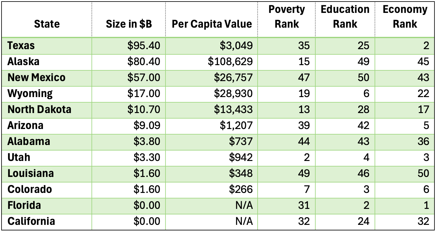 As I dug into the details on the Permanent Fund, I realized a few things. First, there is no correlation between the size of a state’s Permanent Fund and its ranking in poverty, education, and the economy. Additionally, not every state has a permanent fund. Depending on the source, there are 21 or 23 US States with some variation on a Permanent Fund or Sovereign Wealth Fund. However, most are an order of magnitude smaller than ours. Only Alaska and Texas have larger funds.